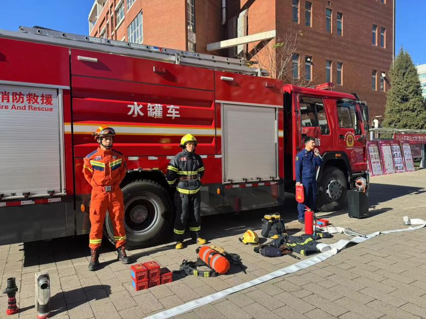 中午12时20分,随着疏散铃声响起,同学们快速反应,按照指引,从宿舍楼内跑到楼下指定安全地带,有序完成学生宿舍疏散演练。同时,部分实验室也同步完成实验室应急疏散演练。随后开启户外安全知识小课堂,消防员们为大家讲解灭火器、灭火毯、防火面罩和消防水带的具体使用方法和注意事项,同时结合实际,从用电安全、火灾自救等方面普及逃生自救常识。并且带领大家探秘消防车,展示了消防车的各项功能和内部构造。在消防员的指导下,老师和同学们亲身体验面罩佩戴及水带灭火,在实践中对消防安全和应急措施有了更深刻的认识。