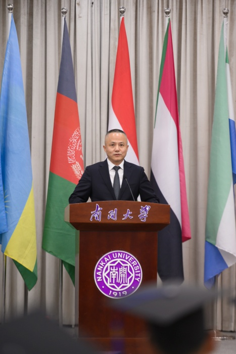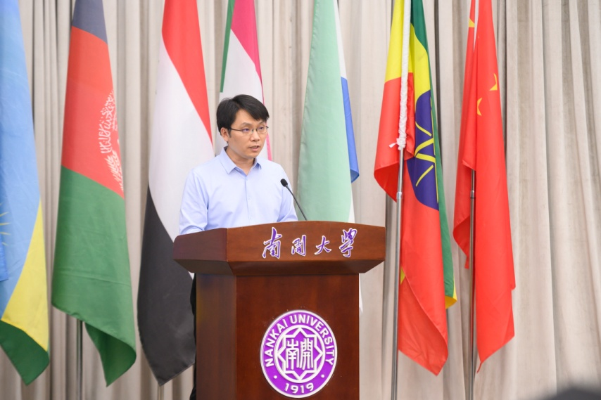 留学生代表奥斯卡先生也上台发言,感谢中国政府和南开大学提供的学习机会,对学院的细致管理表示由衷感谢。