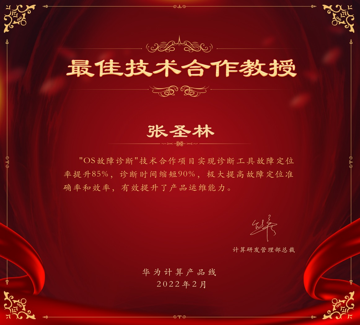 张圣林与华为计算产品线合作的OS故障诊断项目,结项等级为优秀,被华为相关技术专家评估为高价值。项目成果还荣获华为计算产品线技术山头项目悬红奖。