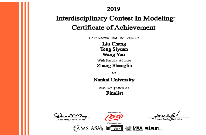 张圣林老师指导的参赛团队在ICM中荣获国际特等奖提名奖(Finalist)。