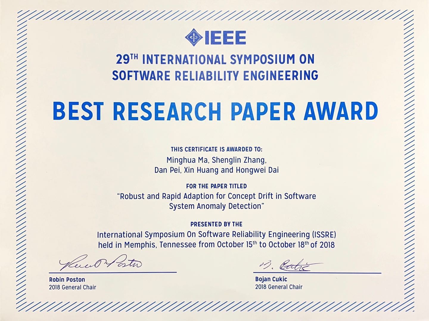 教师张圣林博士与清华大学计算机系裴丹教授、马明华博士,以及搜狗公司高级研发工程师黄昕、代红伟合作发表的论文“Robust and Rapid Adaption for Concept Drift in Software System Anomaly Detection”获得最佳学术论文奖(Best Research Paper Award)。张圣林老师为该论文的通讯作者。该论文为张圣林老师发表在ACM CoNEXT 2015论文工作上的拓展工作。