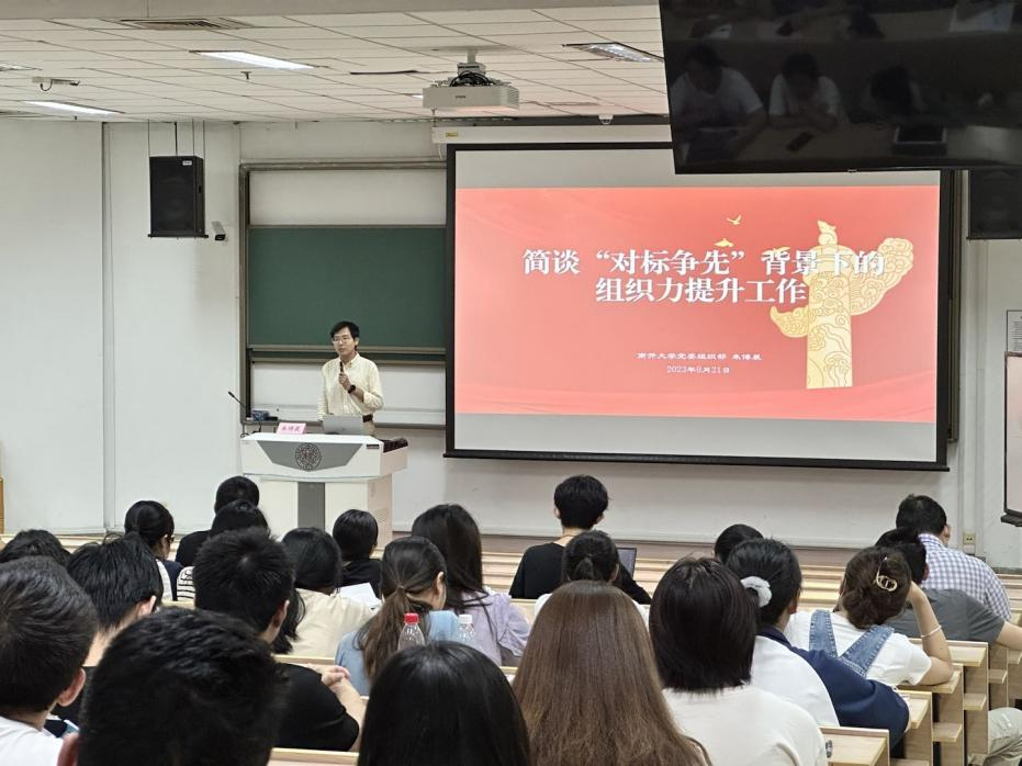 随后,朱博晨着重介绍如何建设样板党支部,他以自身曾担任支部书记的全国党建工作样板党支部为例,分享了建优、建强样板党支部的工作思路、做法和感悟。鼓励学院各支部要抓好党员的理论学习与实践转化,要以“七个有力”为追求,持续深化贯彻习近平总书记来校视察重要讲话精神,积极申报建设样板党支部,在做好支部标准化规范化建设的基础上,结合自身学科特色、支部成员学习和工作实际,积极思考服务中心大局的办法举措,奋力实践,努力建设具有南开特色的先进基层党组织。